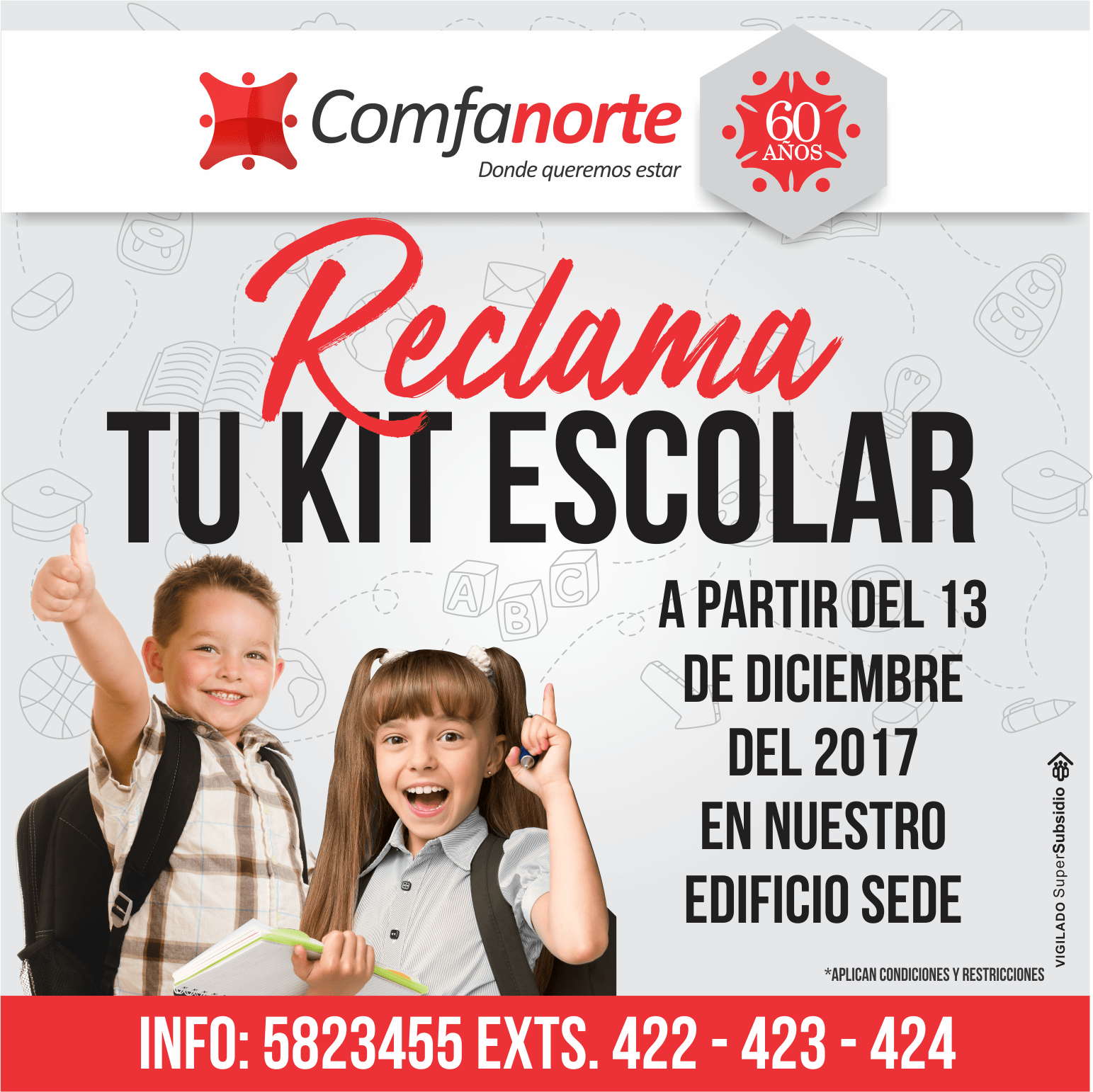 El kit escolar es un subsidio que la Caja de Compensación Familiar del Norte de Santander – Comfanorte, entrega a sus beneficiarios en etapa de escolaridad entre los 5 a los 18 años de edad cumplidos. Para obtener este beneficio, es indispensable que los beneficiarios hayan recibido mínimo siete cuotas monetarias durante la vigencia 2017 y la empresa en la que labora se encuentre al día en sus aportes.