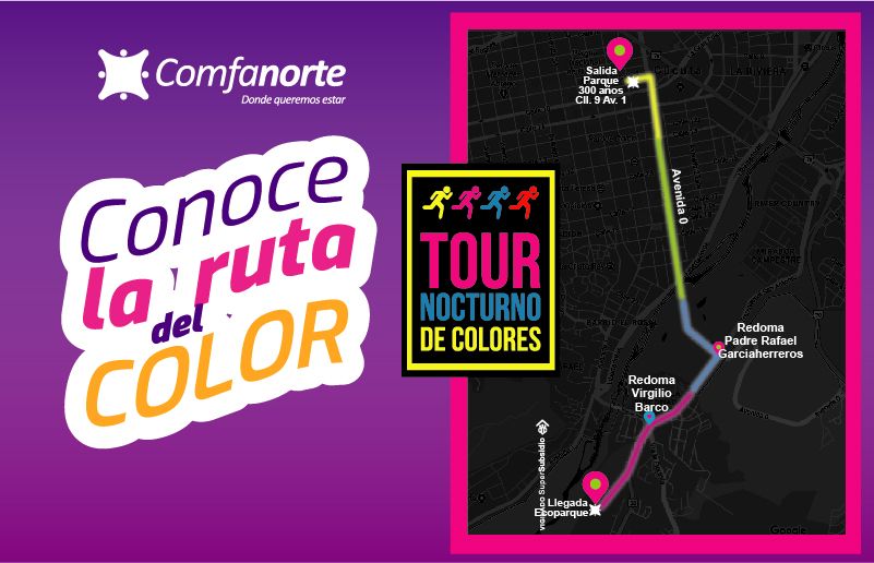 Comfanorte se permite informar que este sábado 28 de septiembre es el espectacular Tour Nocturno de Colores (Carrera recreativa del color) desde las 5:30 p.m. y para ello se realizarán algunos cierres parciales de las vías antes y durante el recorrido a fines de garantizar la seguridad de nuestros participantes.